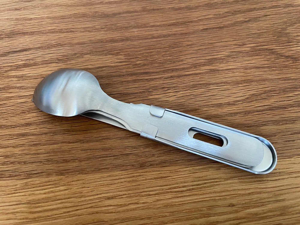キャンプシーンで活躍の「カトラリーセット」は、スプーン・フォーク・ナイフ(栓抜き付)が一つにスタッキング収納でき、携帯性に優れたアウトドアギアです。(ナイフの持ち手の部分にフォークとスプーンをスライドさせてコンパクトに収納可能)