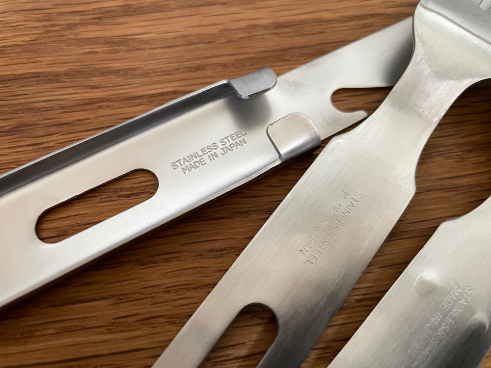 スプーン・フォークは18-0ステンレス製で、ナイフはステンレス刃物鋼(ハガネ)を使用。海外製のものと比べ重厚感のある仕上げとなっています。こちらの「カトラリーセット」は日本製のステンレス技術を活かしたモノに独自のレーザー刻印による名入れを加えています。