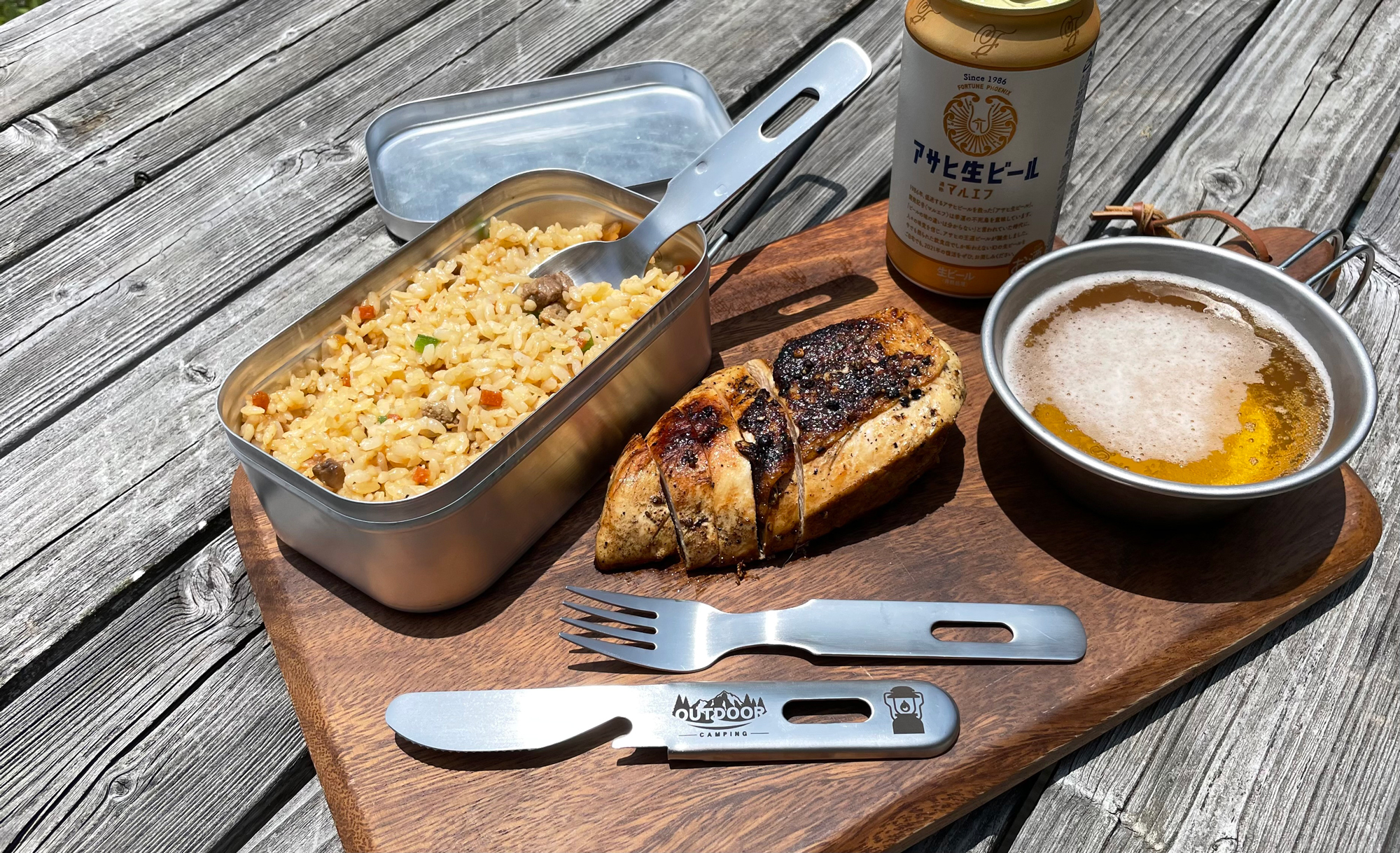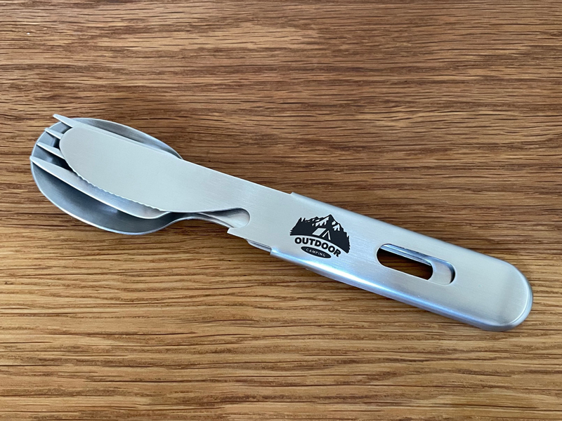 キャンプシーンで活躍の「カトラリーセット」は、スプーン・フォーク・ナイフ(栓抜き付)が一つにスタッキング収納でき、携帯性に優れたアウトドアギアです。(ナイフの持ち手の部分にフォークとスプーンをスライドさせてコンパクトに収納可能)